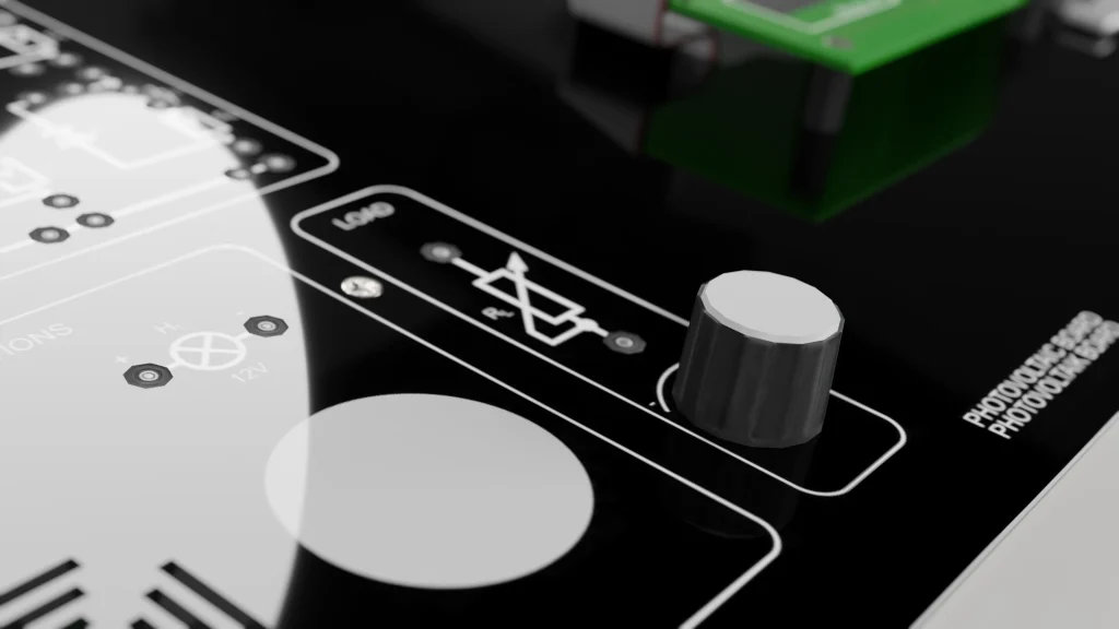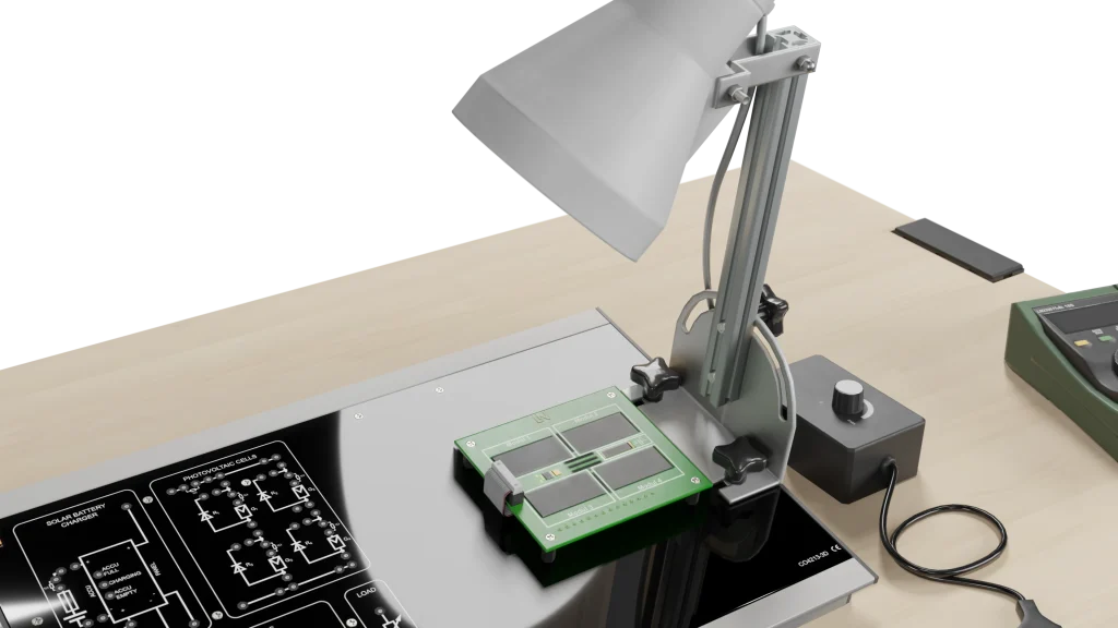 Lernende nehmen die U/I-Kennlinie einer Solarzelle unter verschiedenen Bestrahlungsstärken und Einfallswinkeln auf. Daraus bestimmen sie die charakteristischen Kenngrößen wie Leerlaufspannung (Uoc), Kurzschlussstrom (Isc), Maximum Power Point (MPP) und Füllfaktor.